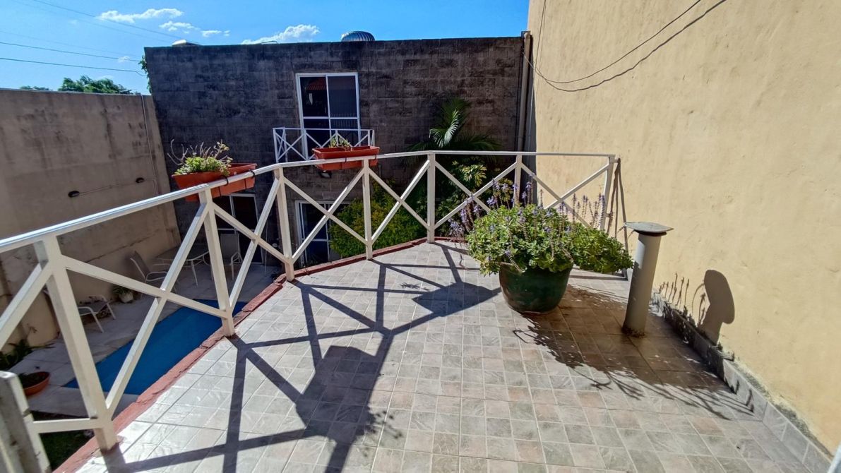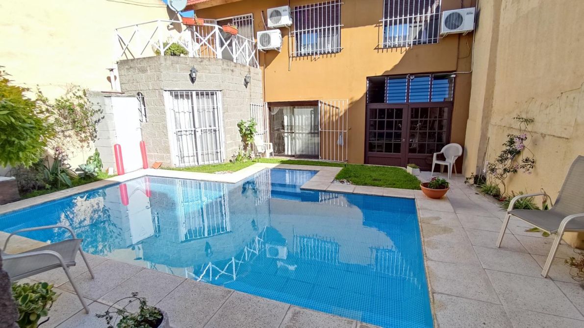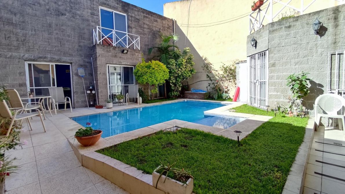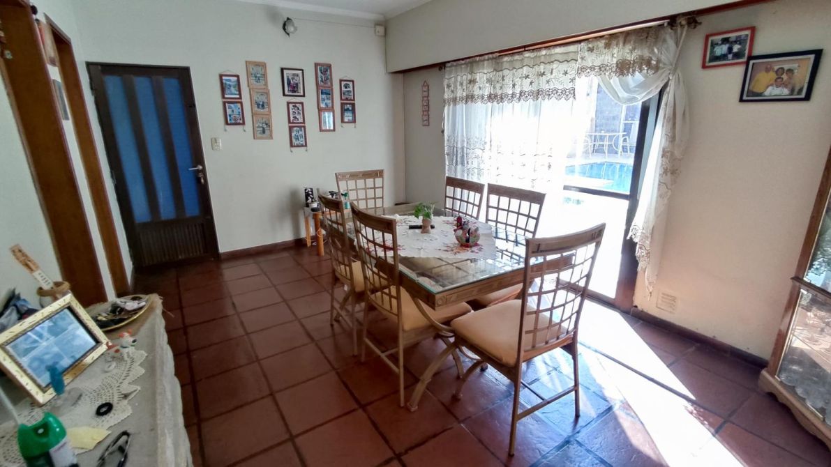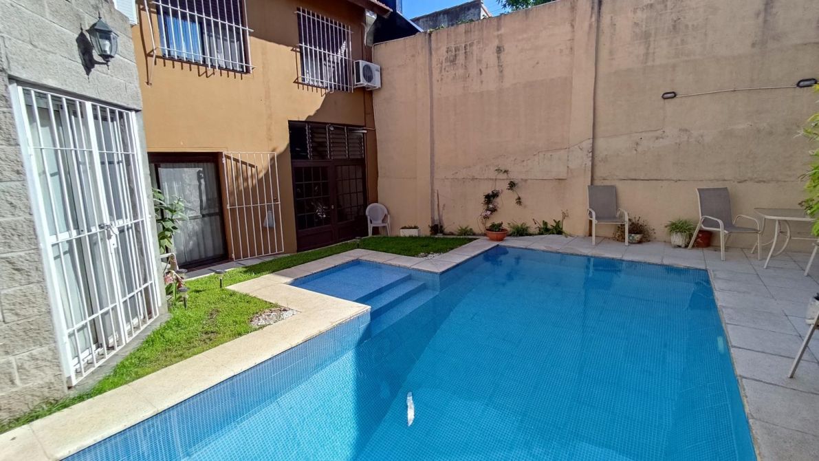 Chalet en excelente estado desarrollado sobre un lote de 9,14 m de frente * 23,04 m de fondo (211 m2 totales), superficie construida 177m2. Se compone de un pequeño jardín al frente, al ingresar a la propiedad cuenta con un living en desnivel con hogar a gas, baño completo con jacuzzi, comedor diario, cocina y cochera pasante para dos vehículos cubiertos; en la planta alta por escalera, se encuentra un baño completo, pequeño placard de guardado, tres dormitorios (el principal cuenta con un pequeño vestidor y balcón con vista al espacio verde. Patio con espacio verde y muy amplia y hermosa pileta; quincho con parrilla, sector de lavadero, baño toilette. En la planta alta del quincho sector de almacenamiento / guardado. El estado general de la propiedad es muy bueno, sus espacios son muy cómodos, ideal familia que quiera comenzar a disfrutar la propiedad!
