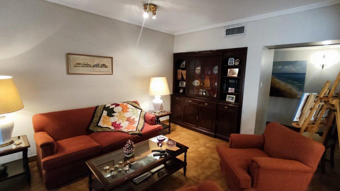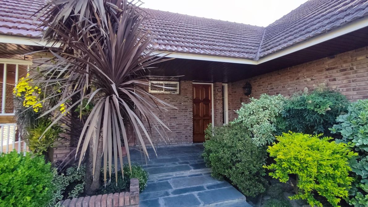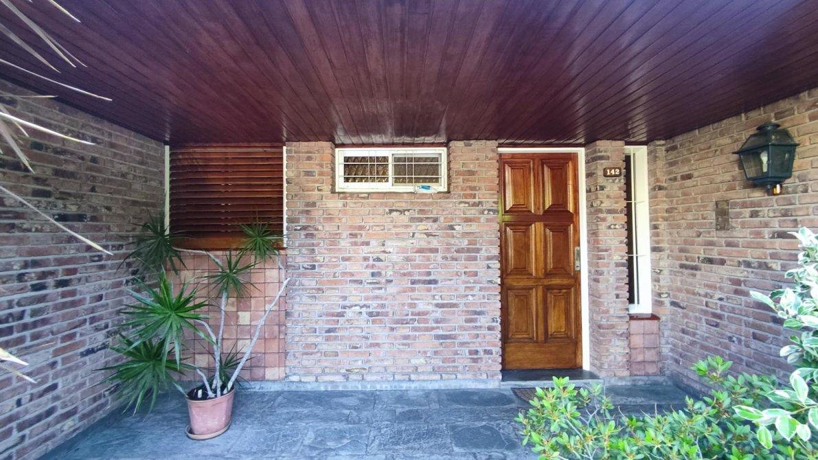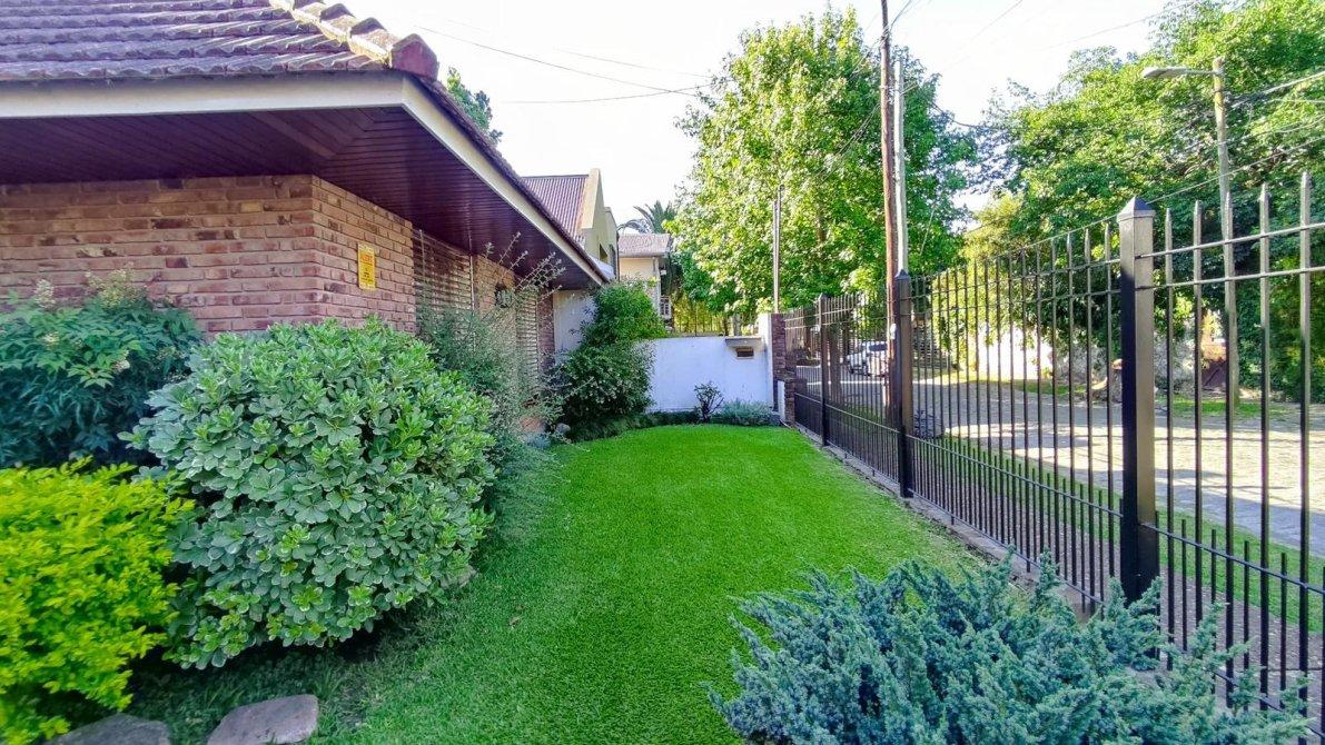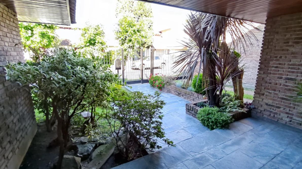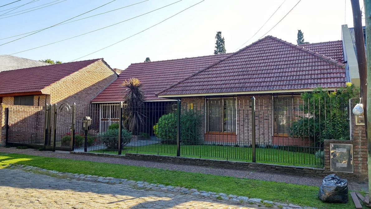 Desarrollada sobre un lote irregular, se compone de jardín al frente, ingreso a la propiedad con cocina completa, lavadero con sistema de calefacción central de frío y aire, comedor que se conecta con el living. Pasillo distribuidor que conecta al baño toilette de recepción con los tres dormitorios completos (todos cuentan con placard empotrado; el dormitorio principal tiene placard empotrado y baulera), y al baño completo con bañera. Ambos baños fueron refaccionados recientemente. Galería, precioso jardín con excelente parquización, cochera pasante para dos autos cubiertos y el resto descubiertos, quincho completo y cuarto de guardado.