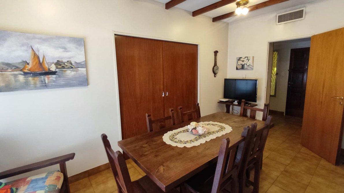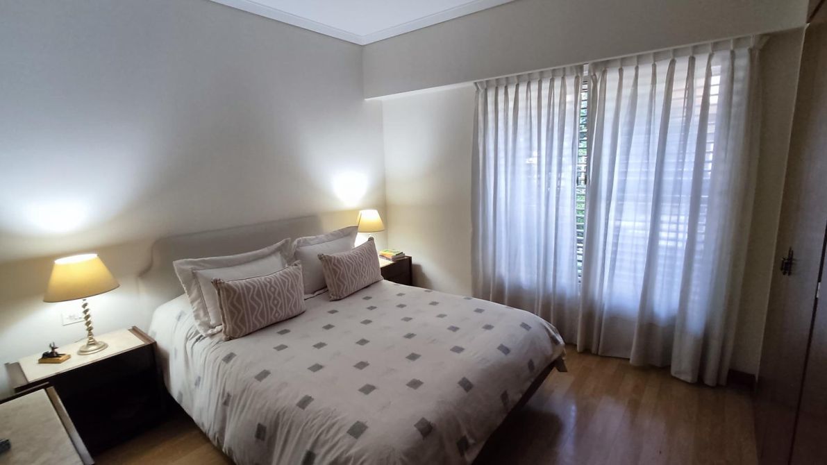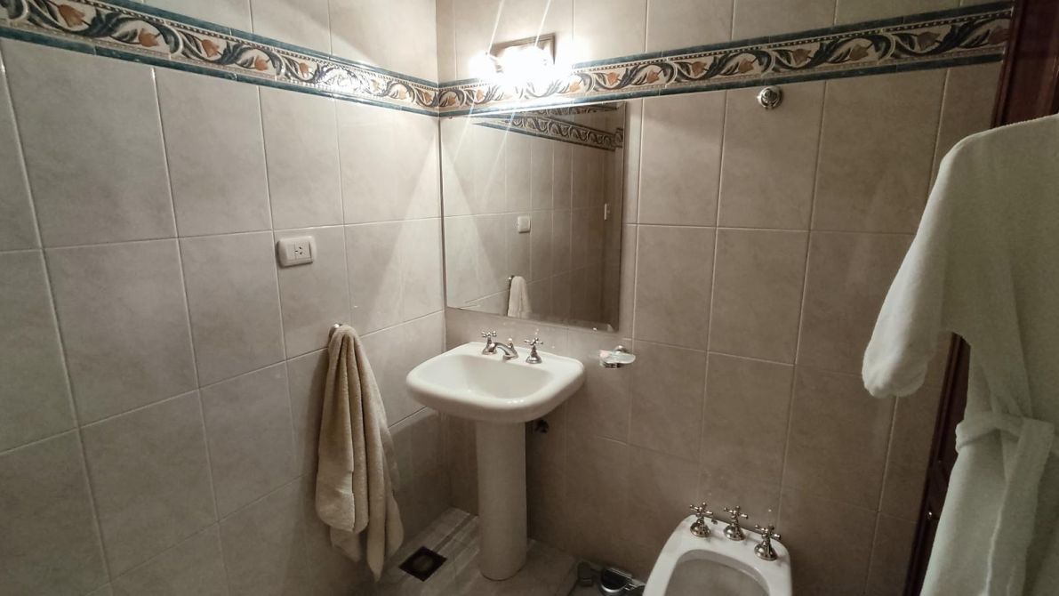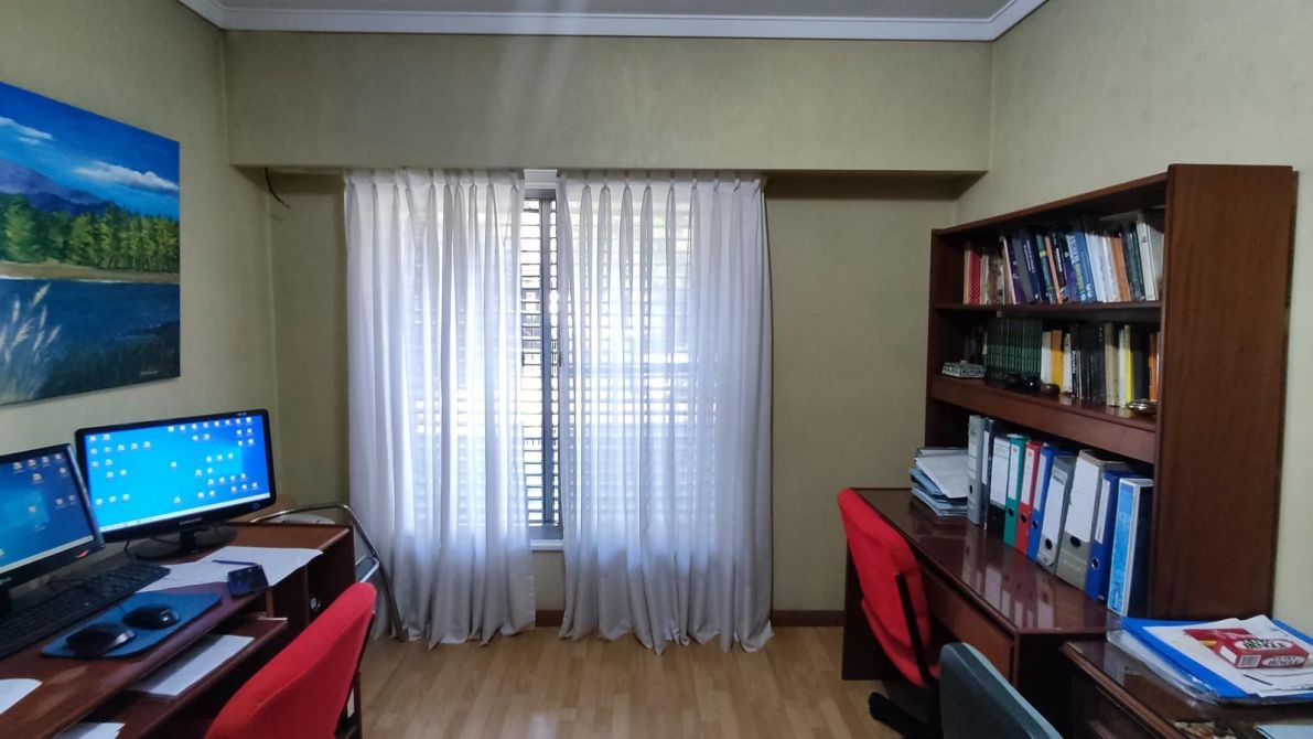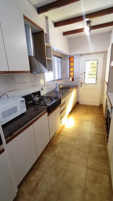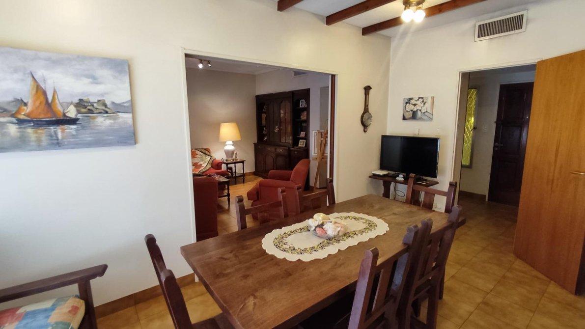 Desarrollada sobre un lote irregular, se compone de jardín al frente, ingreso a la propiedad con cocina completa, lavadero con sistema de calefacción central de frío y aire, comedor que se conecta con el living. Pasillo distribuidor que conecta al baño toilette de recepción con los tres dormitorios completos (todos cuentan con placard empotrado; el dormitorio principal tiene placard empotrado y baulera), y al baño completo con bañera. Ambos baños fueron refaccionados recientemente. Galería, precioso jardín con excelente parquización, cochera pasante para dos autos cubiertos y el resto descubiertos, quincho completo y cuarto de guardado.