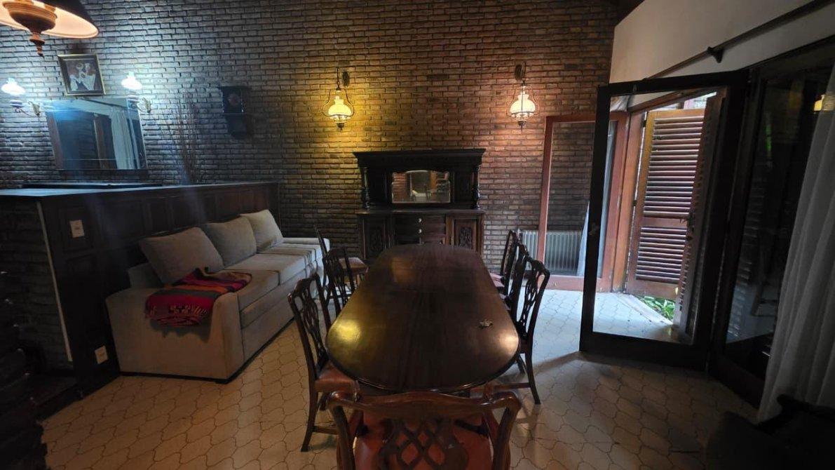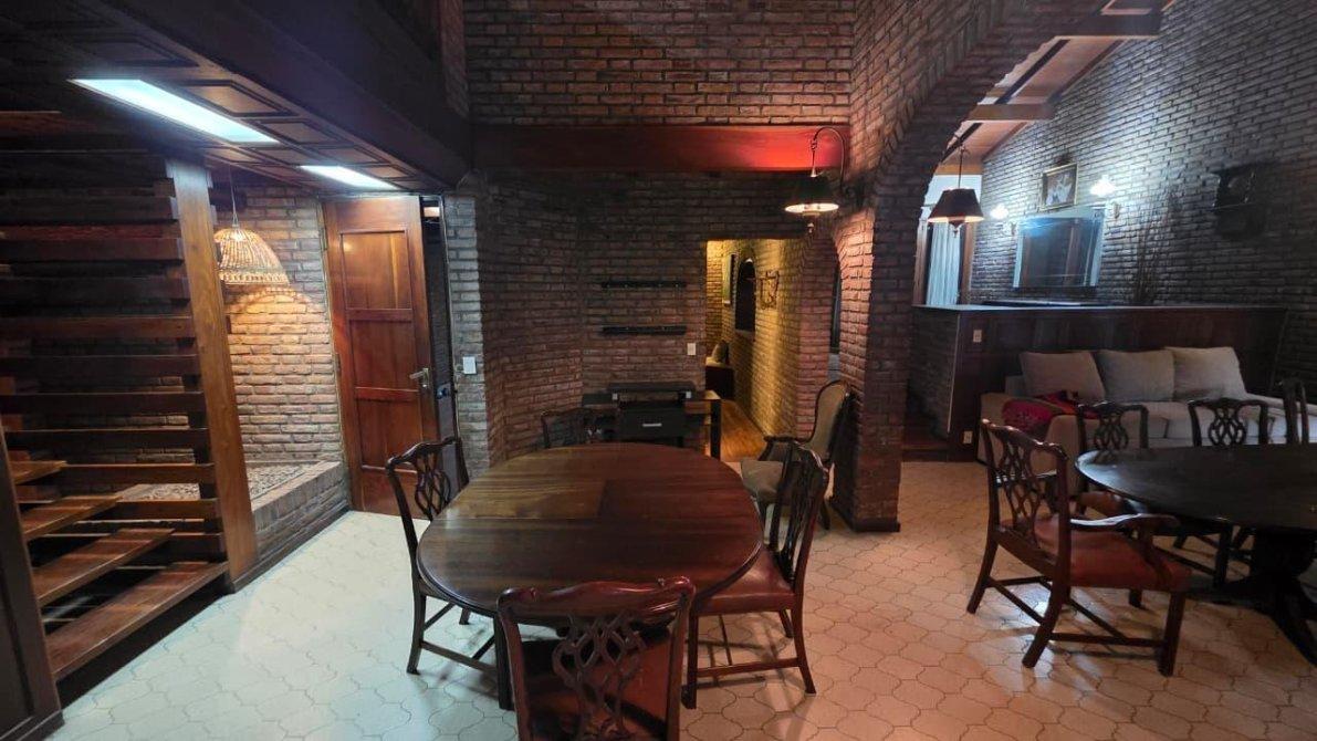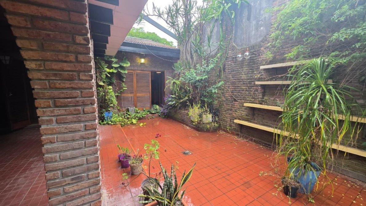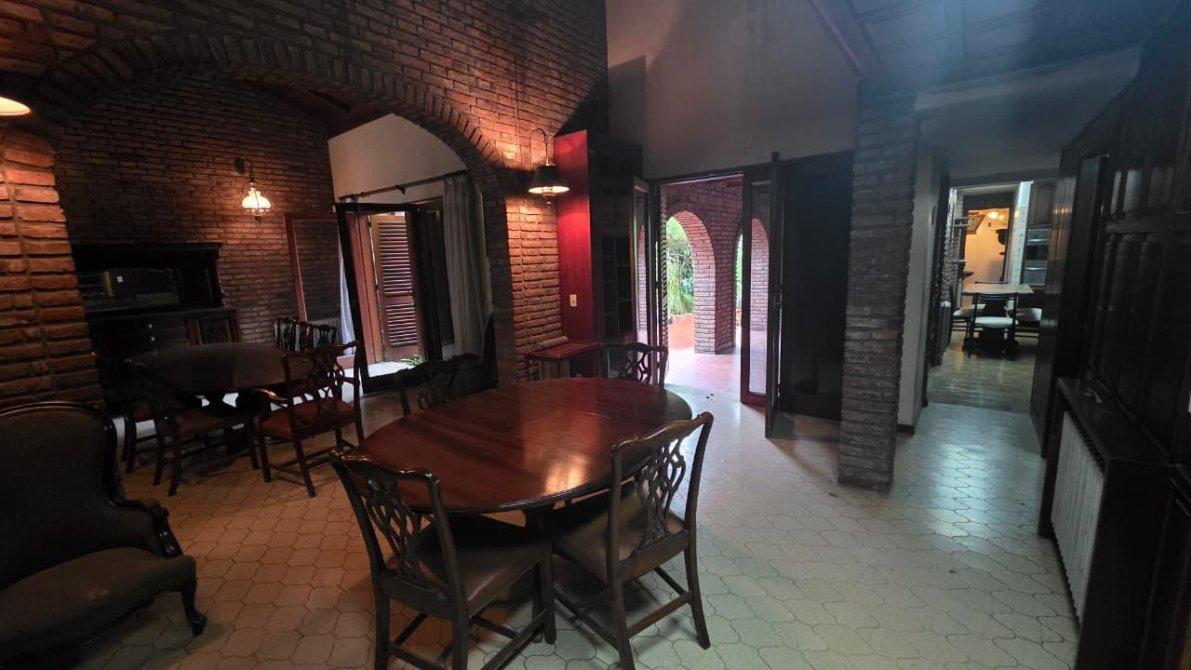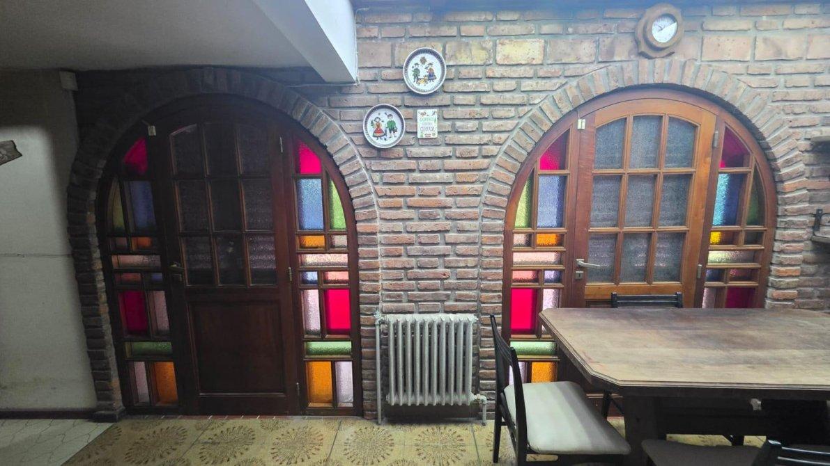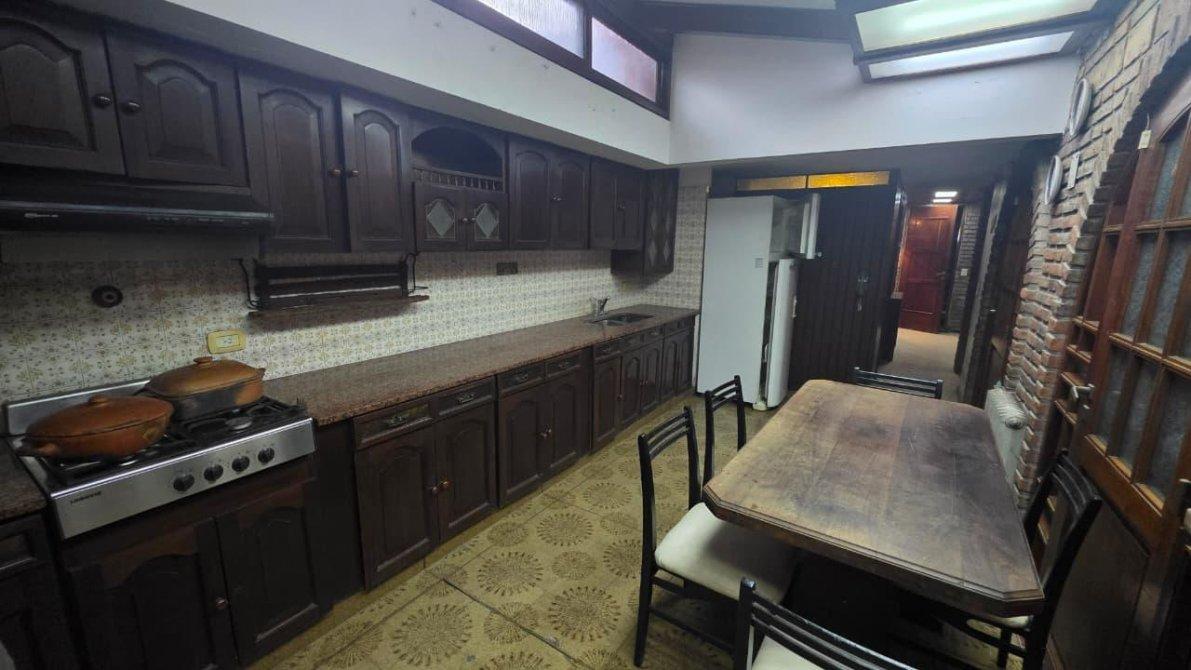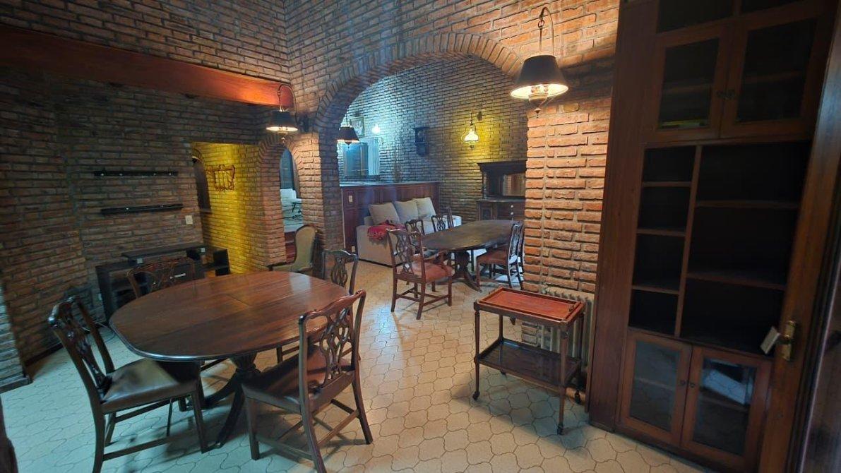 Desarrollado sobre un lote de 10 m de frente por 38 m de fondo (381m2); cuenta en planta baja con un jardín al frente, cochera cubierta para dos autos con un placard de guardado. Saliendo de la cochera, ingresamos a un amplio ambiente de comedor formal en doble altura, con dos ventanales que dirigen al patio y a la galería cubierta; se completa este espacio con un living en desnivel con piso de madera entarugado, con ventanal a la calle y entrada principal desde el jardín frontal; conectado al living, un bar con excelente vitró decorativo y un baño toilette. La planta baja cuenta también con sala de máquinas y despensa, muy amplia cocina comedor con muebles sobre y bajo mesada de algarrobo en excelente estado; este ambiente cuenta con dos puertas con hermosos vitró coloridos que dirigen a la galería también. Al finalizar la cocina, cuenta con un sector de lavadero, y segundo baño toilette con ducha. Saliendo al patio descubierto, extensa una galería con parrilla y un jardín parquizado impecable.